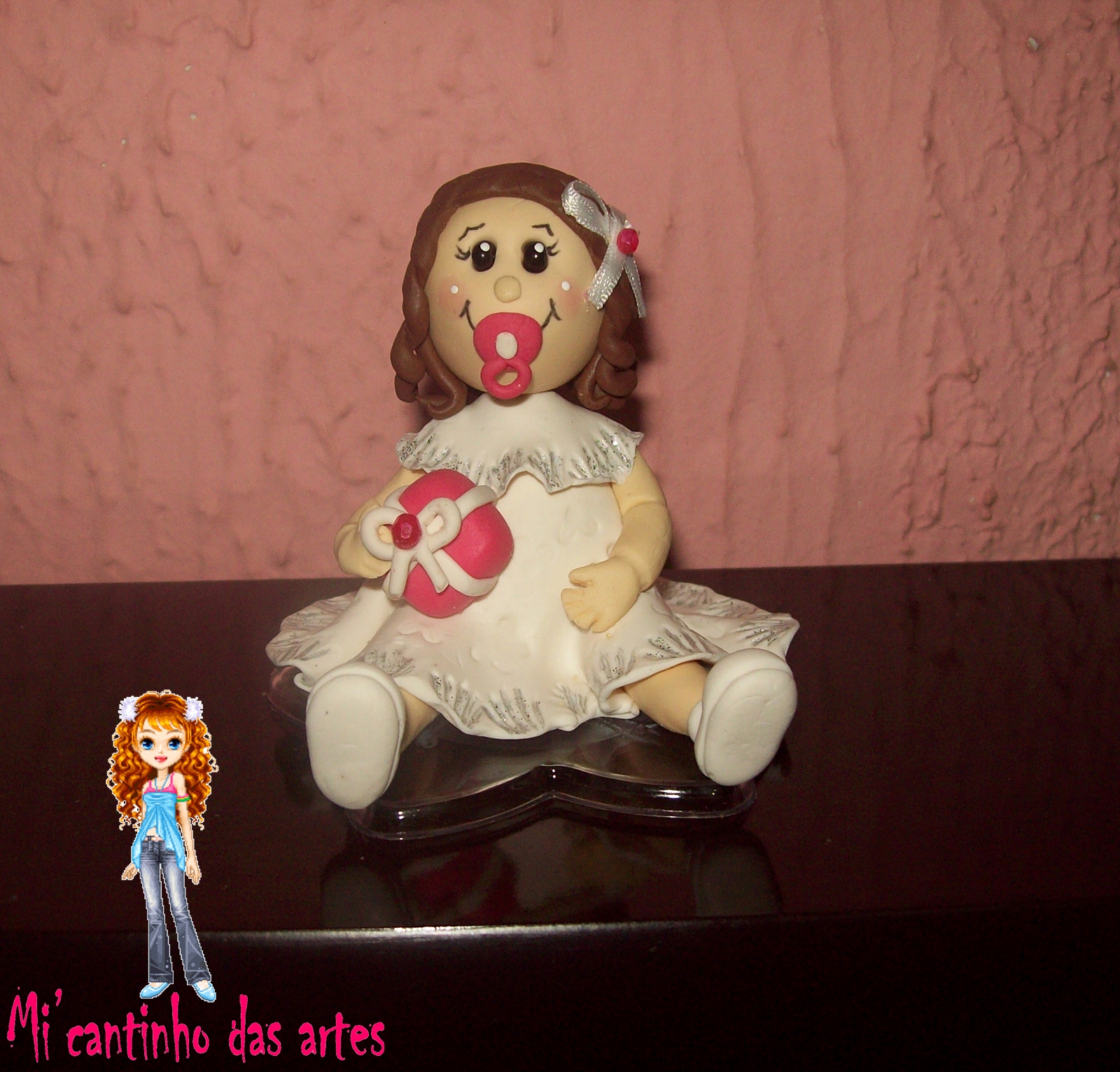 Bonequinha segurando seu presente feita em biscuit, serve para topo